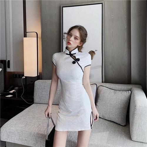 [에이치플러스몰]여성 프릴 화이트 치파오 원피스 미니