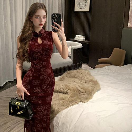[교복몰]레드 로즈패턴 키홀 벨벳 치파오 원피스 교복 학생복