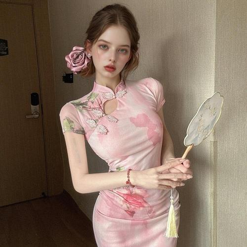 [교복몰]로즈 블러썸 플라워패턴 슬림핏 실루엣 치파오 원피