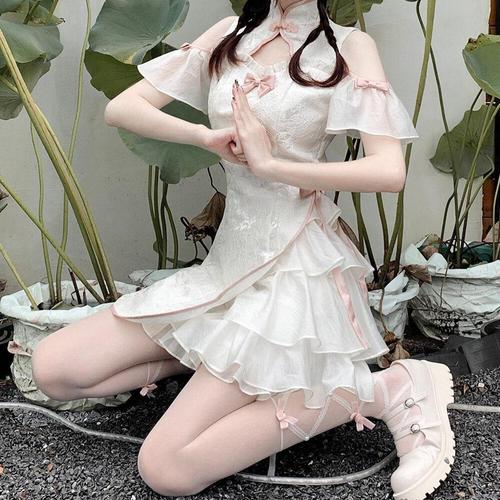[교복몰]핑크리본 포인트 화이트 치파오 원피스 교복 학생복