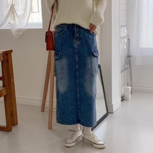 [다잇템]여자 일자 백슬릿 카고치마 빈티지진 롱스커트