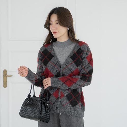 (울함유) 아가일 체크 카라 울 니트 가디건 데일리룩 아가일니트 오피스룩 데이트룩 c