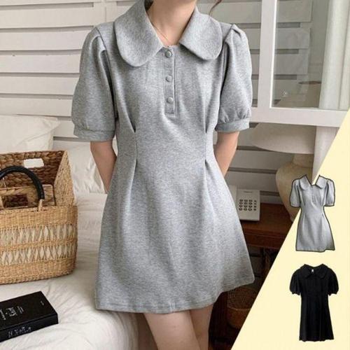 [옷자락] [시즌오프]여름 심플 데일리 배색 카라 반팔 퍼프 원피스_5