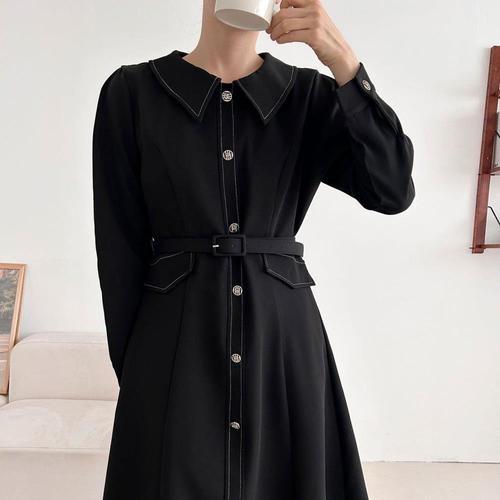 [옷자락] [시즌오프]셔츠형 도톰 스티치카라 플레어 벨티드 원피스_5
