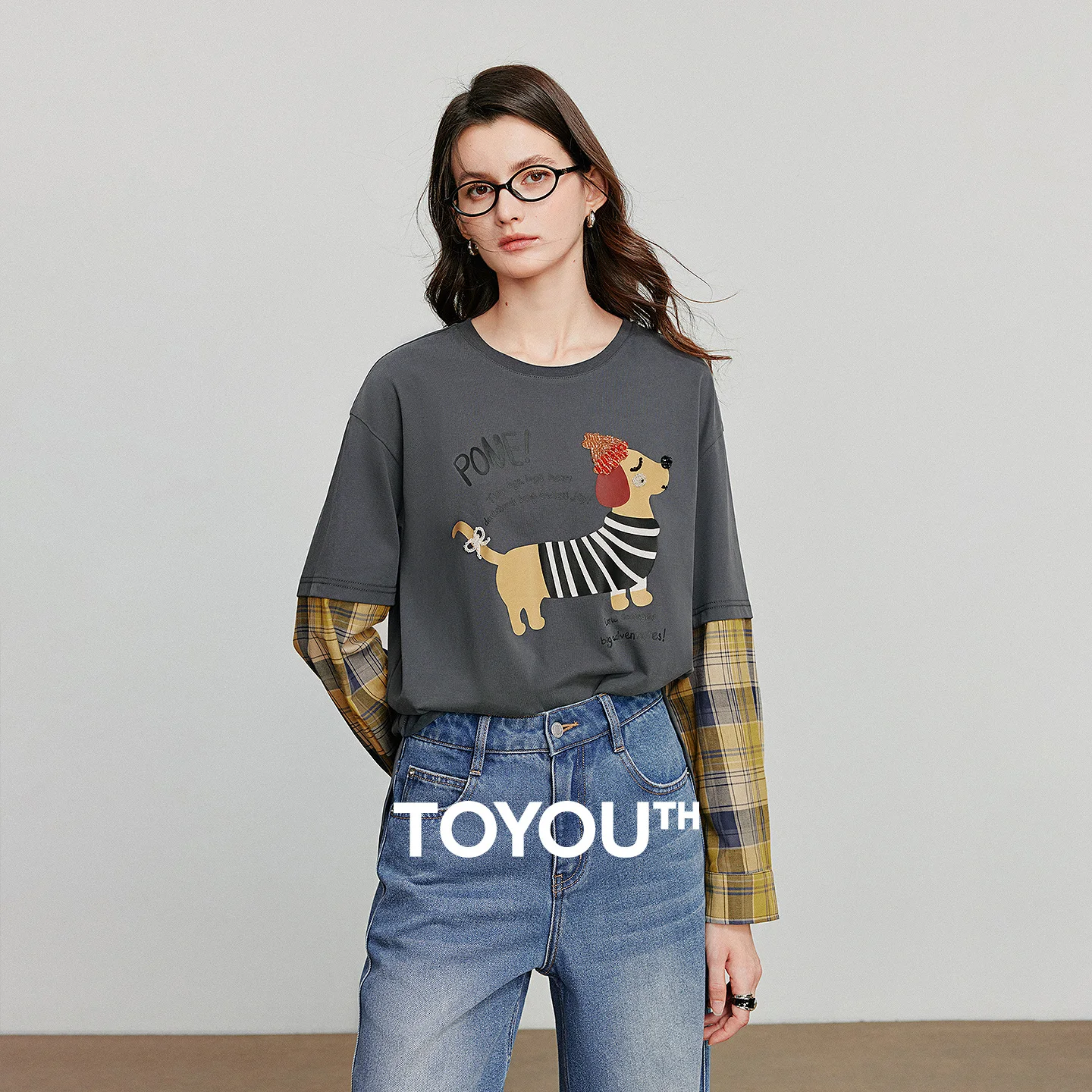 TOYOUTH 여성 후드티 스웨트셔츠 2025 가을 신상 코튼 강아지 프린트 스플라이싱 소매 페이크 투피스 라운드넥 풀오버 탑