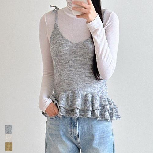 [큐즈]여성 뷔스티에 프릴 울 니트 끈조끼 라운드 나시 봄 가을 데일리룩 그레이 오트밀 카키