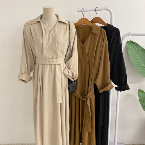 허니제이 / 벨트세트 브레온 핀턱 카라 셔츠 롱 원피스(3color)