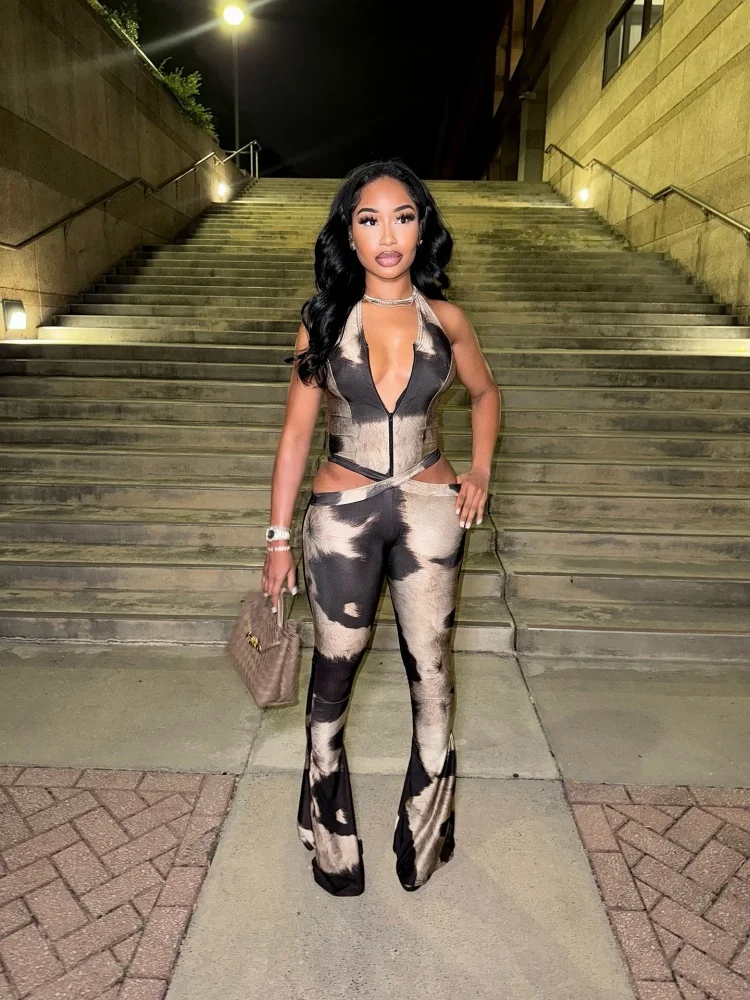 시스터 스타 여성 점프수트 패션 섹시 브이넥 홀터 슬리브리스 홀로우 스트리트 스타일 우아한 출퇴근용 롱 점프수트 의상