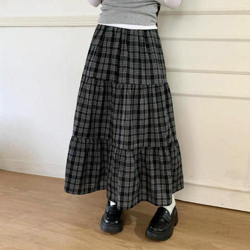 [옷자락] 여자 사계절 면 체크 밴딩 캉캉 플레어 롱스커트