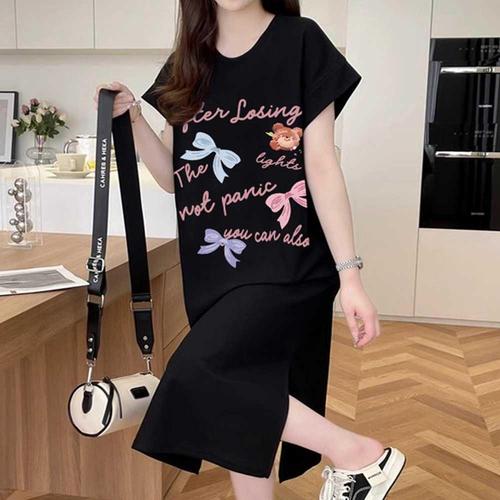 (대박난) 150kg까지 빅사이즈 1+1 여성 캐릭터 프린트 옆트임 롱 원피스 여름 편한 반팔 심플 베이직 박스 루즈핏 날씬해보이는 무지 외출용 모던 시원한 캐쥬얼 4xl 원피스