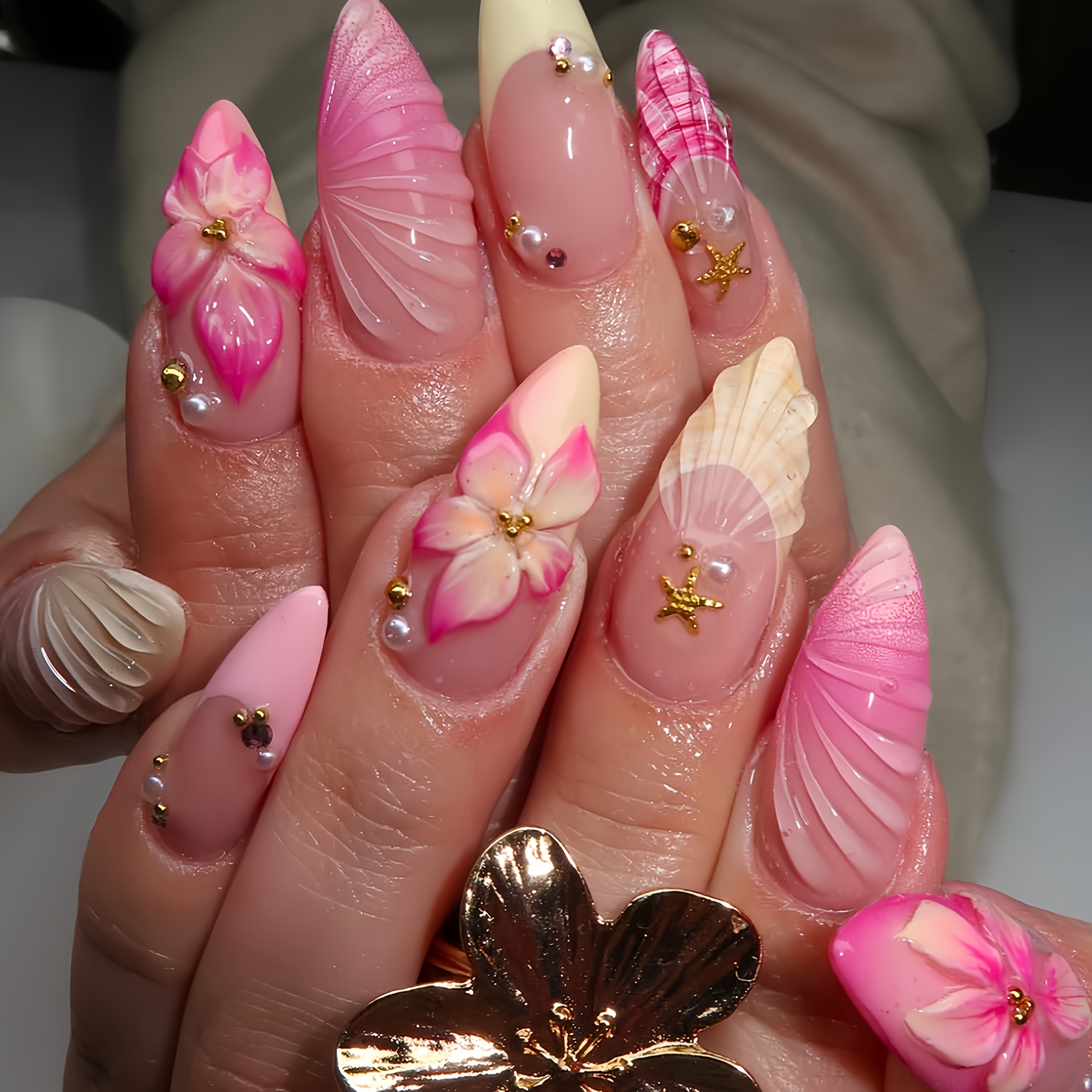 TEMU 24개 세트의 중간부터 긴 아몬드 모양의 손톱, 프랑스 스위트 꽃 패턴 및 귀여운 금성어, 부드러운 곡선이 있는 반짝이는 금색 비즈/핑크 3D 나비 조각 꽃/여름 3D 그라데이션 아이스 꽃, 모든 여성에게 적합합니다. 손톱 파일 및 젤리 접착제 포함, 여성에게 여름 선물로 사용할 수 있습니다.