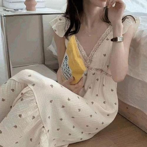 이너퀸 프리수 여성용 레이스 카라 밴드넥 브라캡 캡내장 노브라 롱 긴팔 하트 플라워 패턴 원피스 잠옷 홈웨어 이지웨어 빅레이스원피스