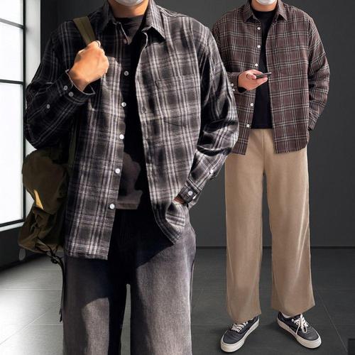 ANYOU 커플 추동 루즈핏 체크 긴팔 셔츠
