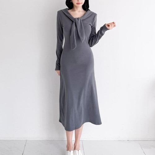 가치채움 프렌치 리본 벨트 플레어 원피스 (하객룩/데이트룩) 우아한 셔츠 스타일 롱 원피스 / 리본 스트랩 드레스