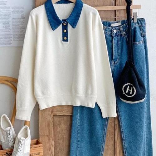[다잇템][다잇템] 여성 카라넥 스웨터 버튼 진 코디 키치무드_23329089_588872