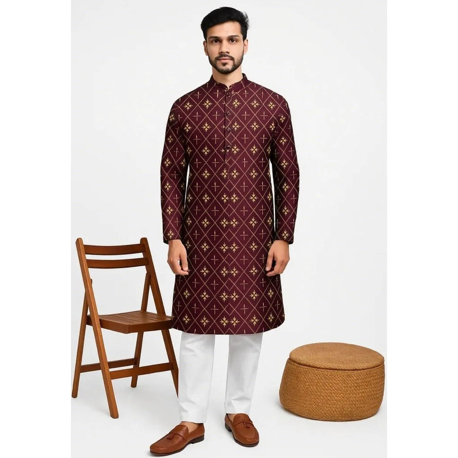 남성 디지털 프린트 쿠르타 셔츠 레귤러 핏 만다린 칼라 롱 웨딩, 하리 라야, 국가 스타일 등 모든 행사에 적합