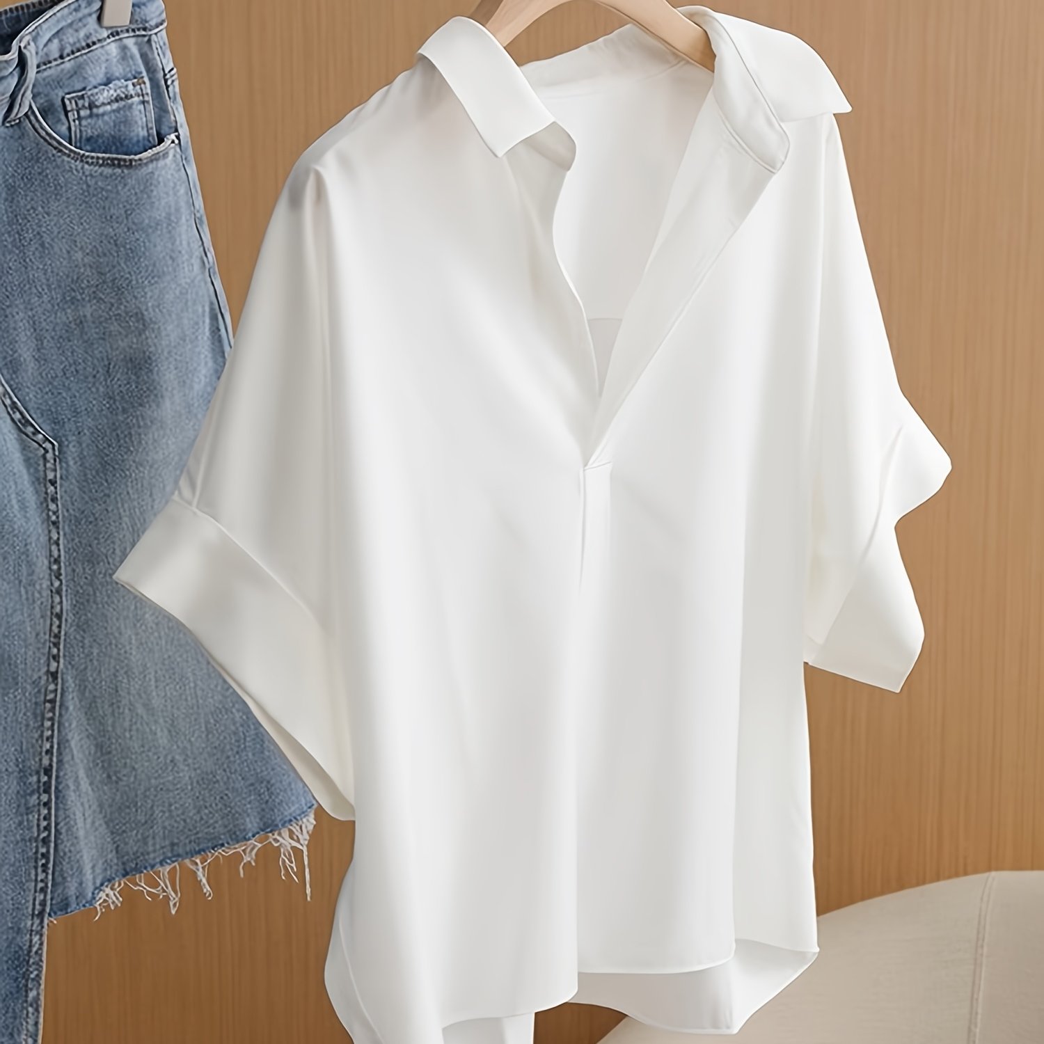 TEMU 여성용 프렌치 스타일 배트윙 V넥 반팔 블라우스 - 여름용 화이트 루즈 배트윙 탑, 봄/여름을 위한 우아한 프렌치 스타일, 캐주얼 & 세미셔츠 (아니요)