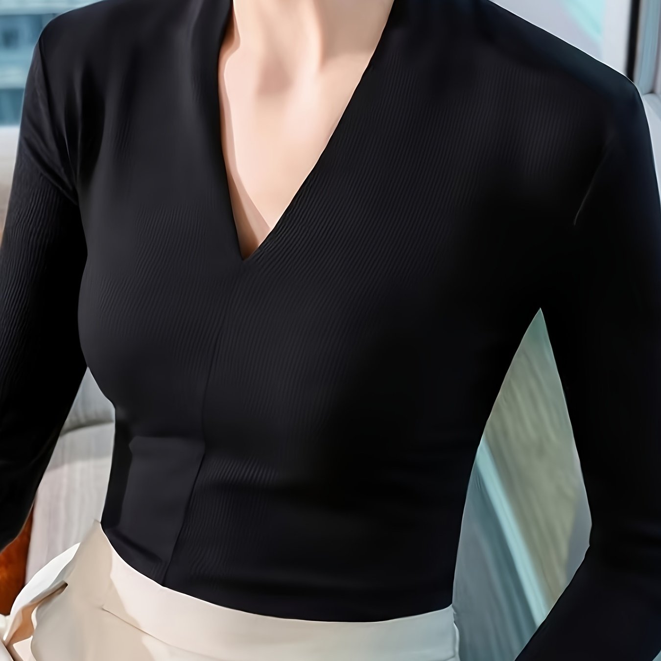 TEMU 여성용 소프트 엘레강트 V넥 긴팔 블라우스 - 솔리드 컬러 베이스 레이어 탑, 미디엄 스트레치 불투명 셔츠, 레이어링용, 세탁기 사용 가능 겨울 튜닉, 캐주얼 & 특별한 날 - 재고 있음, 대량 구매 불가