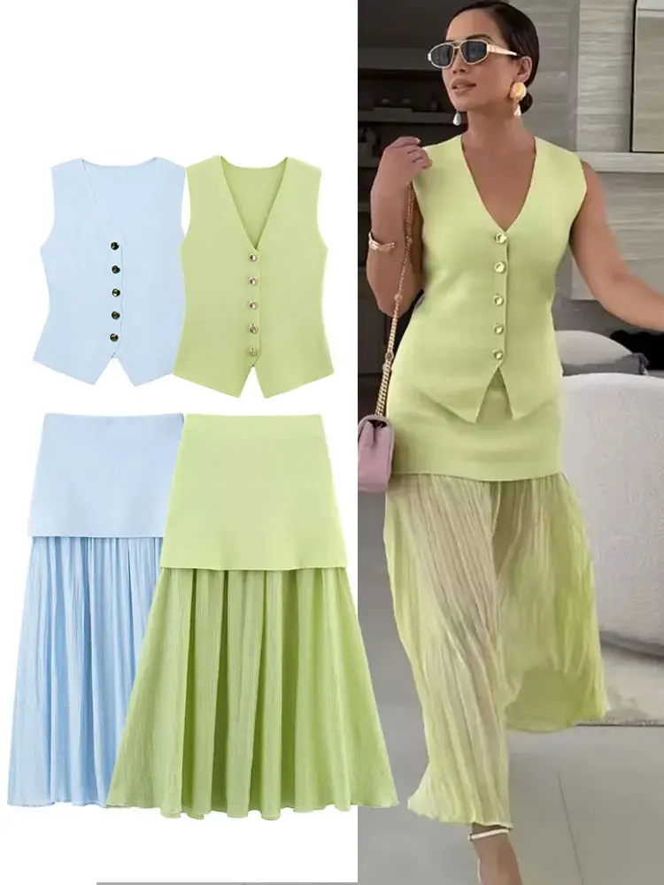우아한 니트 패치워크 플리츠 스커트 세트 여성용 브이넥 베스트 탑+엘라스틱 웨이스트 솔리드 미디 스커트 여성 정장 의상