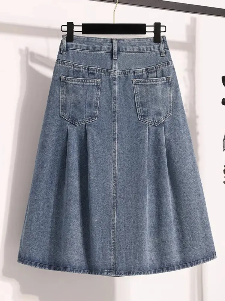 여름 플러스 사이즈 여성 데님 스커트 하이 웨이스트 A라인 플리츠 미디 스커트 살 커버 작은 사이즈 여성 고어드 스커트