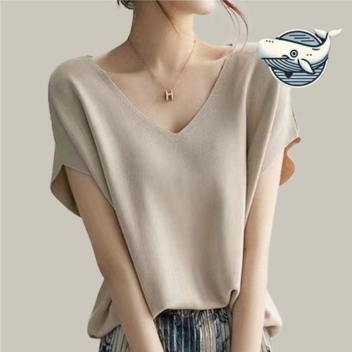 [에이치플러스몰]여성 여름 브이넥 반팔 니트 티셔츠 쿨 베이지