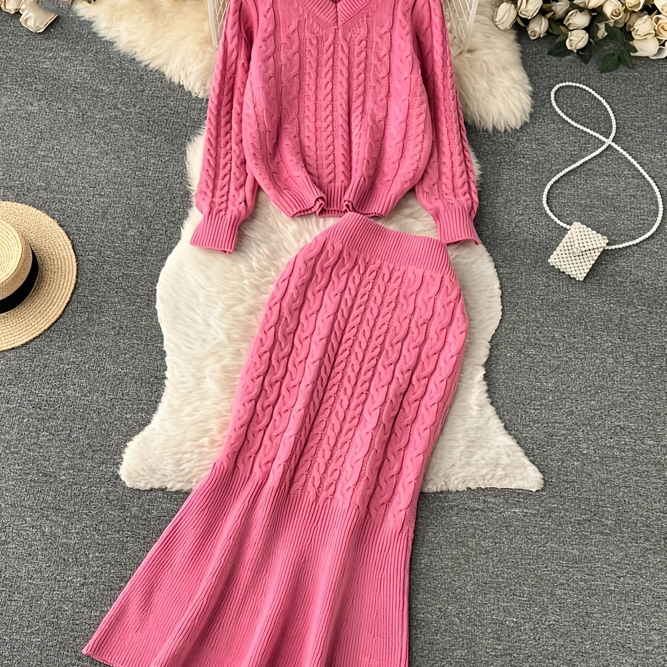 TEMU BK0222074+방향성 재료+패션 V넥 캐주얼 드레스 세트, 우아한 케이블 스웨터 투피스 세트, 긴 소매, 단색, 캐주얼 웨어, 스웨터 아웃핏