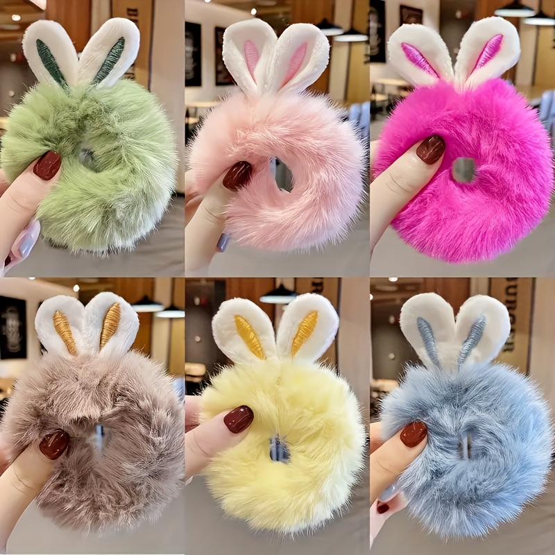 TEMU 귀여운 플러시 토끼 귀 머리끈 6개입, 포니테일, 더블 포니테일용, 머리에 부드러움, 헤어 밴드, 헤어 액세서리.
