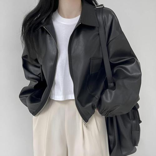 [센트럴몰]크롭 레더 집업 자켓 여성 루즈핏 아우터