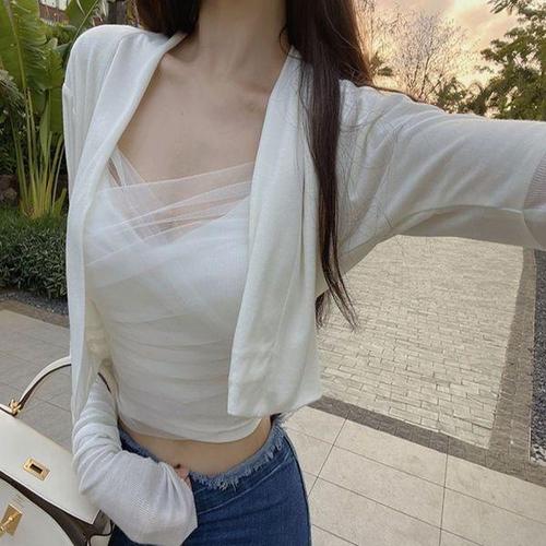 [에이치플러스몰]여성 5컬러 쉬폰 브이넥 세미크롭 끈나시 이너 민소매
