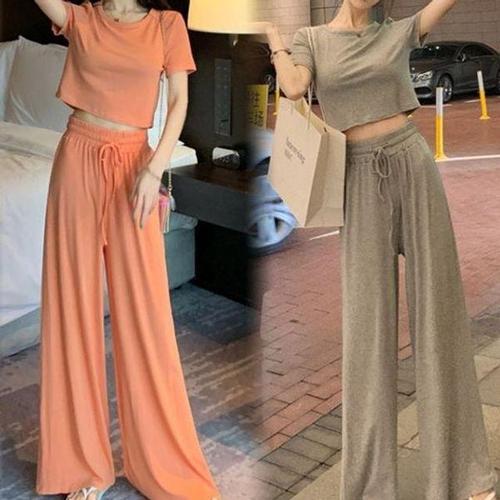 크롭탑 스판 긴바지 팬츠 여자상하세트 반팔 밴딩 여