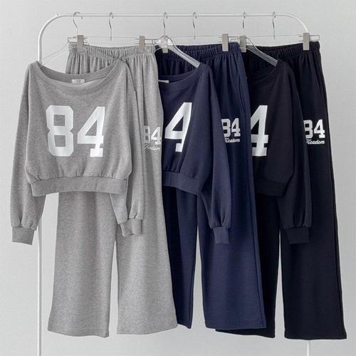 [옷자락]여성 오프숄더 크롭 맨투맨 봄 트레이닝 와이드 바지 세트