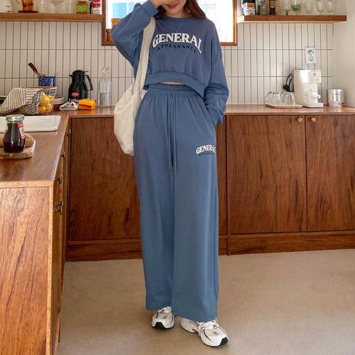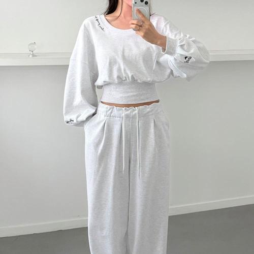 [옷자락] 여자 크롭 자수 퍼프 맨투맨 핀턱 와이드팬츠 세트