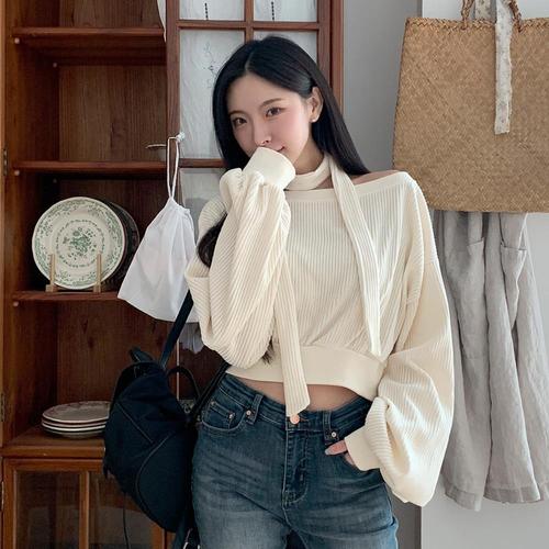 [옷자락]여자 오프숄더 세미 크롭 골지 퍼프 맨투맨