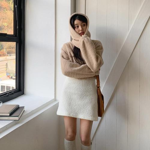 [옷자락]여자 양털 크롭 맨투맨 바라클라바 세트