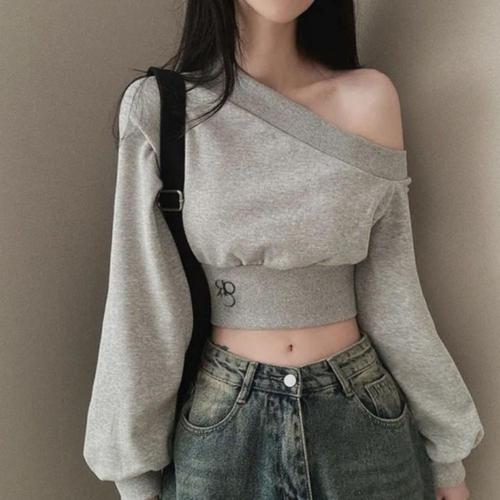 맨투맨 원오프숄더 크롭긴팔티 무지 여자 오프숄더티셔츠 WFK7UDX