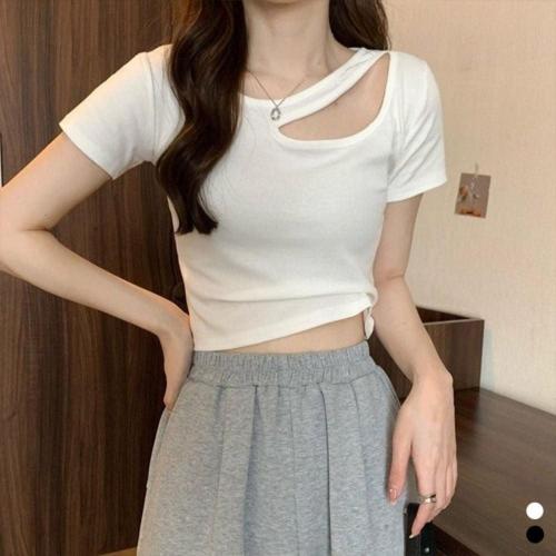 [에이치플러스몰]쇄골 트임 크롭 반팔티셔츠 2color DK-0358