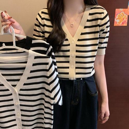 반팔 니트 브이넥 스트라이프 크롭 니트티 가디건 WFM72KO