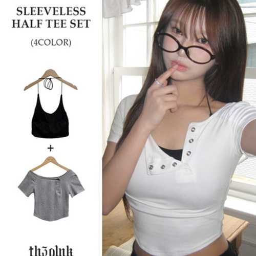 더핑크 / 오넬 슬림핏 홀터 크롭 나시 + 버튼 반팔티 set