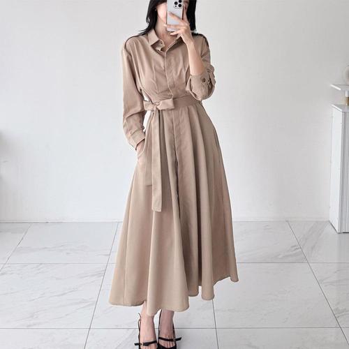 [옷자락] 여자 클래식 허리스트랩 셔츠 플레어 롱 원피스