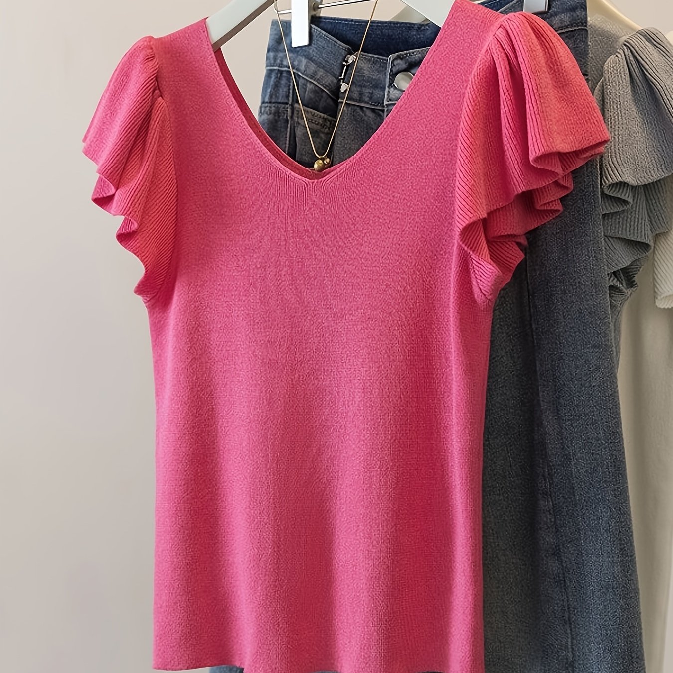 TEMU 여름 로즈 레드 V넥 러플 셔츠 여성 슬림핏 디자인 니치 탑 스위트 앤 스파이시 스타일 아이스 원단 칙체제 데이트룩, 칙체제 로맨틱 데이트, 모임, 여름 마켓 및 기타 장면에 적합, 통기성, 피부 친화적