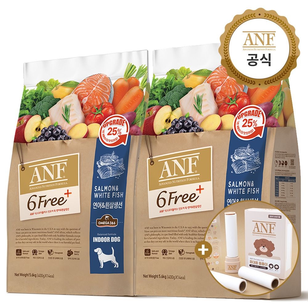 [N] ANF 식스프리플러스 인도어 독 소고기&연어 5.6kg + ANF 캔 24개(G) +돌돌이