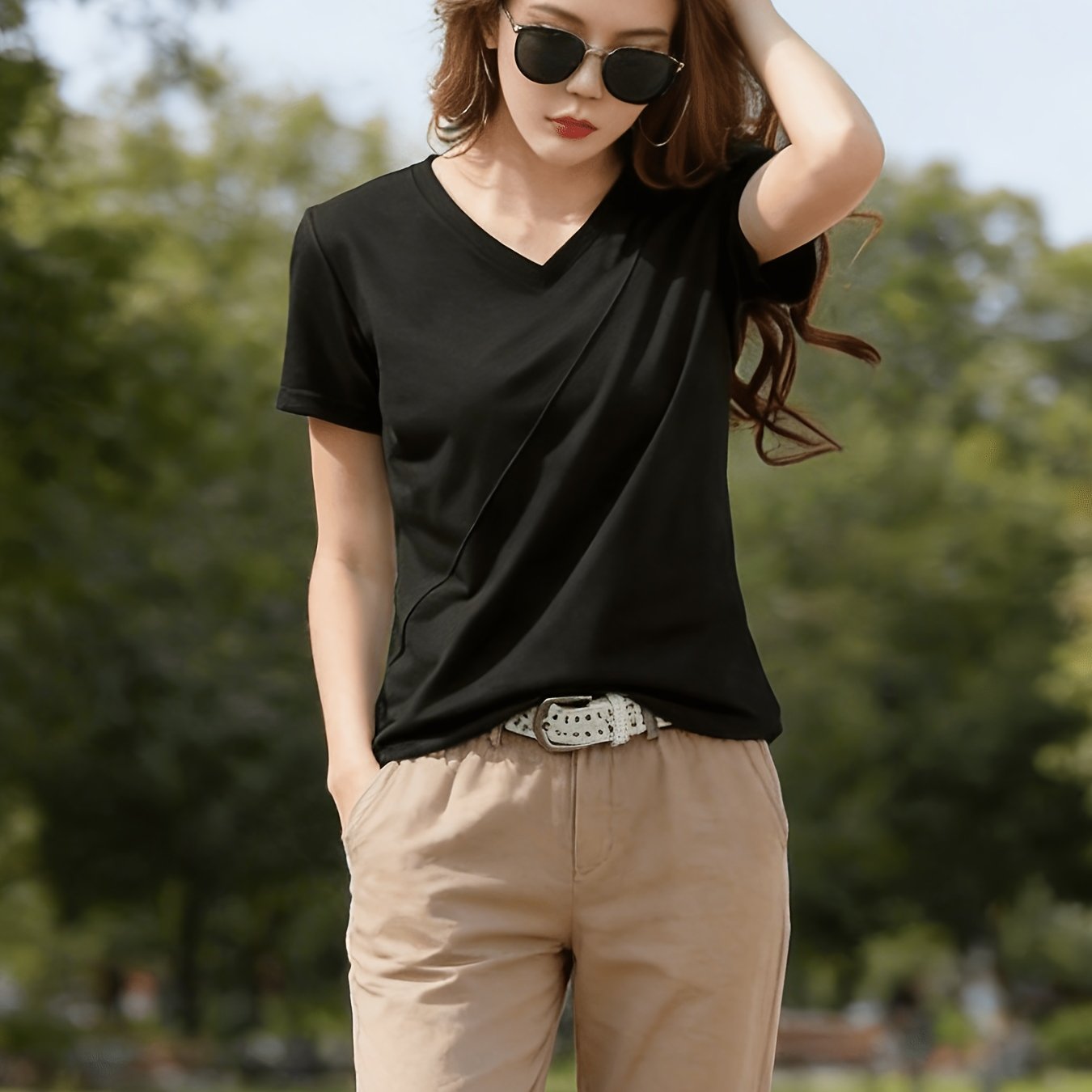 TEMU 여성용 얇은 V넥 반팔 티셔츠, 고급 아이스 섬유 원단, 시크한 상의