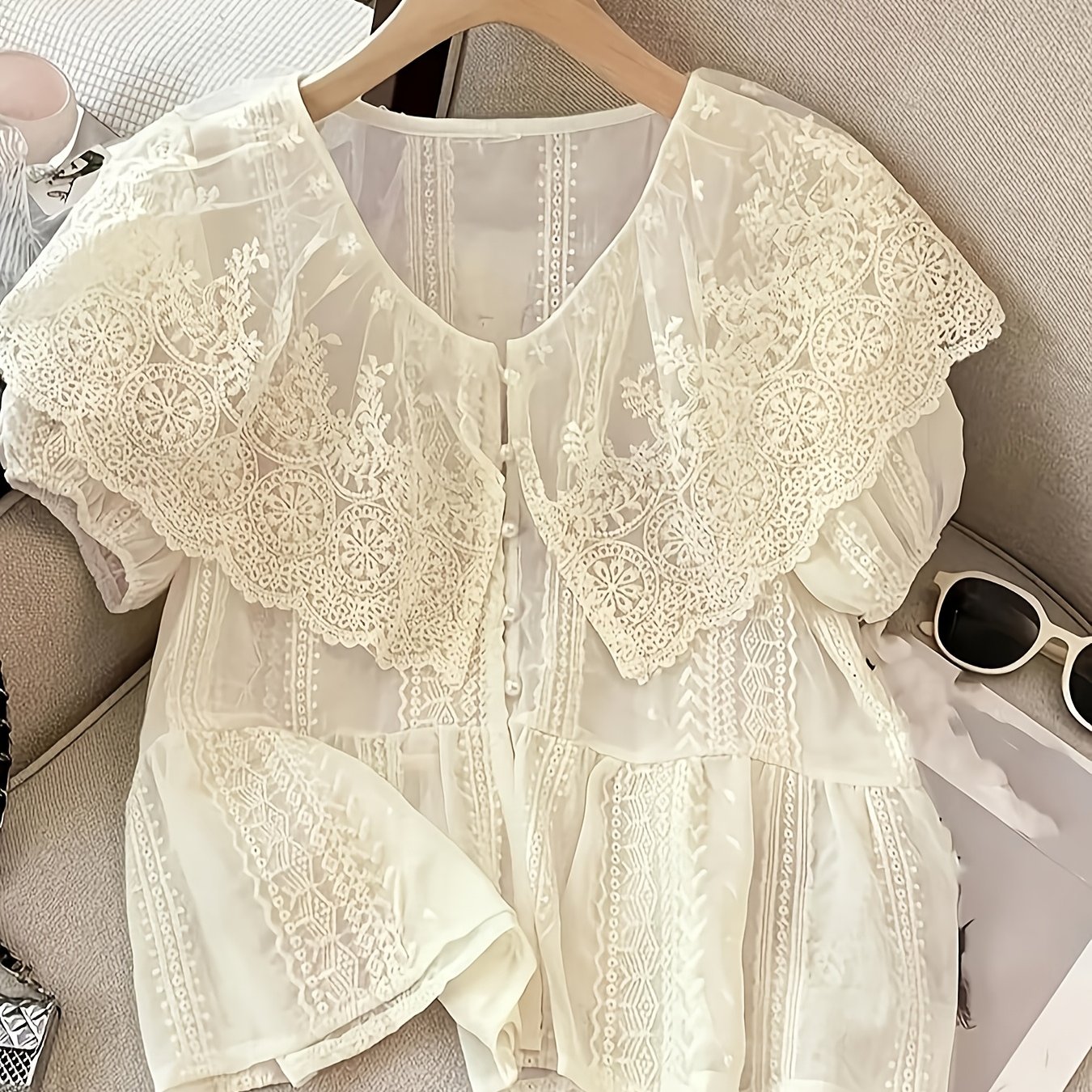 TEMU 여성용 홀우드 디자인 레이스 셔츠, V넥과 넉넉하고 다재다능한 핏