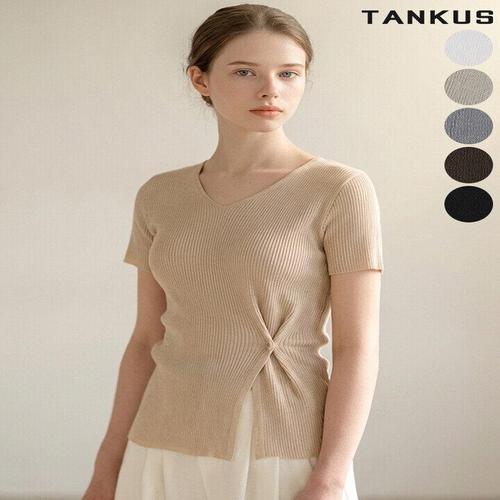 [탱커스]여성 V넥 슬릿 디테일 골지 반팔 니트