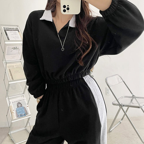 더클립 / 토르 배색 넥트임 카라 크롭 맨투맨 와이드 팬츠SET