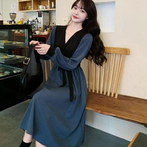 besteffie 여성원피스 봄 가을 투톤 배색 루즈핏 고급스러운 A라인 스트링 간절기룩 빅사이즈 미디원피스 C88