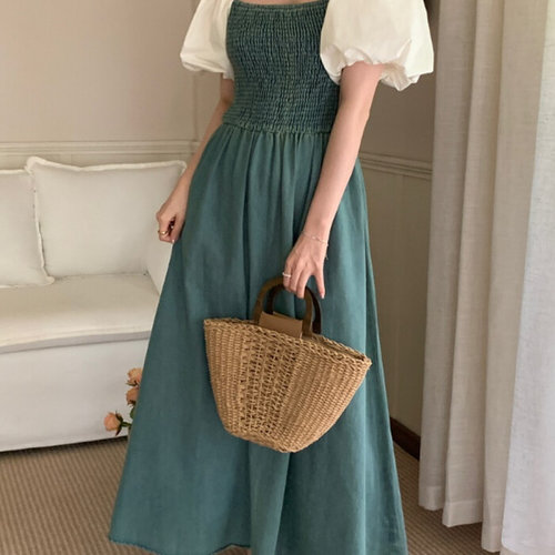 샵앤) 국산 여성 라운드 투톤 배색 주름 오버핏 롱원피스 LL-WDR-4671-베이지