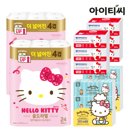 [런칭10주년] 헬로키티 골드라벨 4겹 24롤2팩+팝업티슈6팩+키친타올6팩