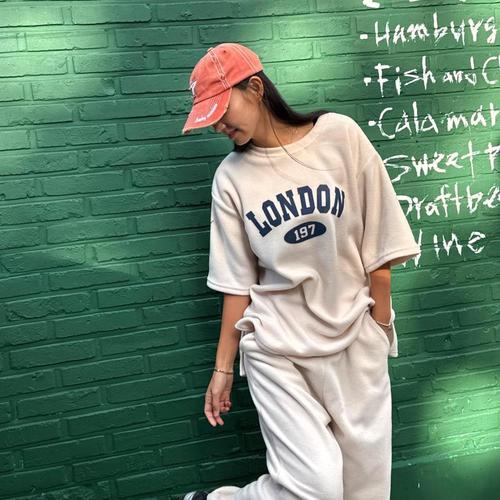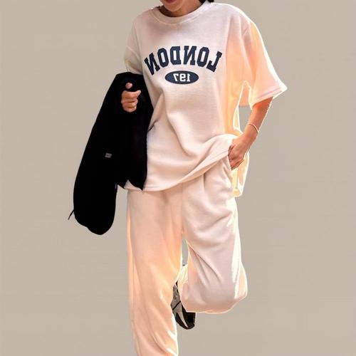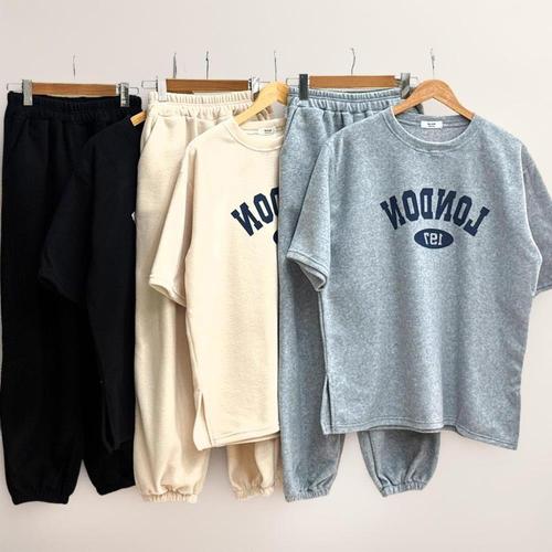 [미라클세븐]여성 옆트임 레터링 기모 반팔 티셔츠 후리스 조거 팬츠 세트