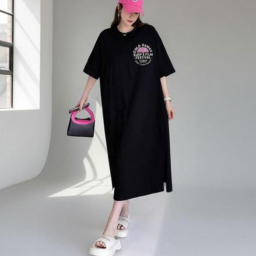 베이직 NC58EN03 레터링 여성 밑단 트임 캐주얼 반팔 롱 원피스